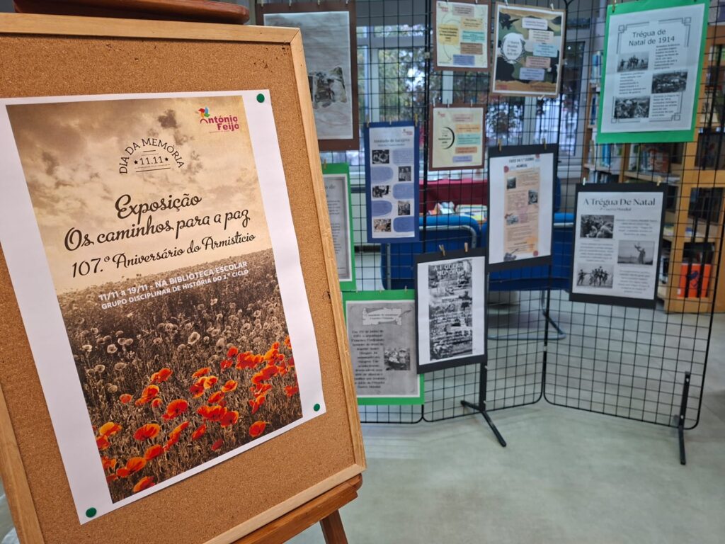 Foi inaugurada, no passado dia 11 de novembro, na Biblioteca Escolar, a exposição “Caminhos para a Paz – Assinalar o Armistício!”, uma iniciativa do Grupo Disciplinar de História do 3.º ciclo. A mostra estará patente até ao dia 19 de novembro e pretende assinalar o 107.º Aniversário do Armistício da Primeira Guerra Mundial, firmado em 1918.